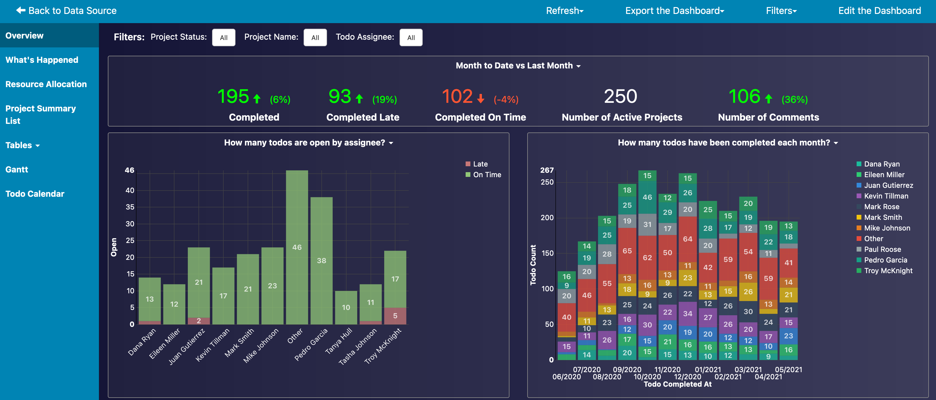 Never question where your team is with a project. Easy Insight pairs seamlessly with other project management tools so you have the utmost visibility into what's happening across all your projects. Track performance, look for overdue or unassigned tasks, and take your projects from creation to completion faster and with more ease than ever before.