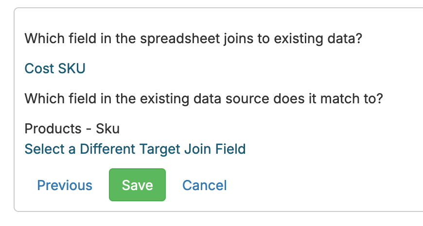 Click on the source you want to add the Excel/CSV source to. Finally, you're able to set up the way the uploaded data is linked to the chosen source. For example, in this case, our uploaded data contains SKU information, so we'll choose the SKU fields from both sources: