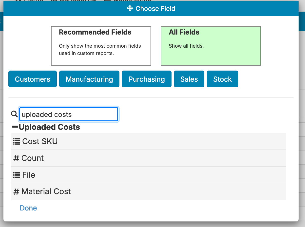 Once this setup is done, the fields from the Excel/CSV data are available as a folder in the chosen data source. In this case, the fields now show up in the Cin7 data source: