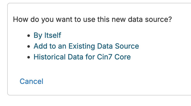 You can add Excel/CSV data sources to your other data sources to help with consolidated reporting. After creating a new Excel/CSV data source by uploading data, you'll be prompted with a few options for what you want to do with your new data source:
