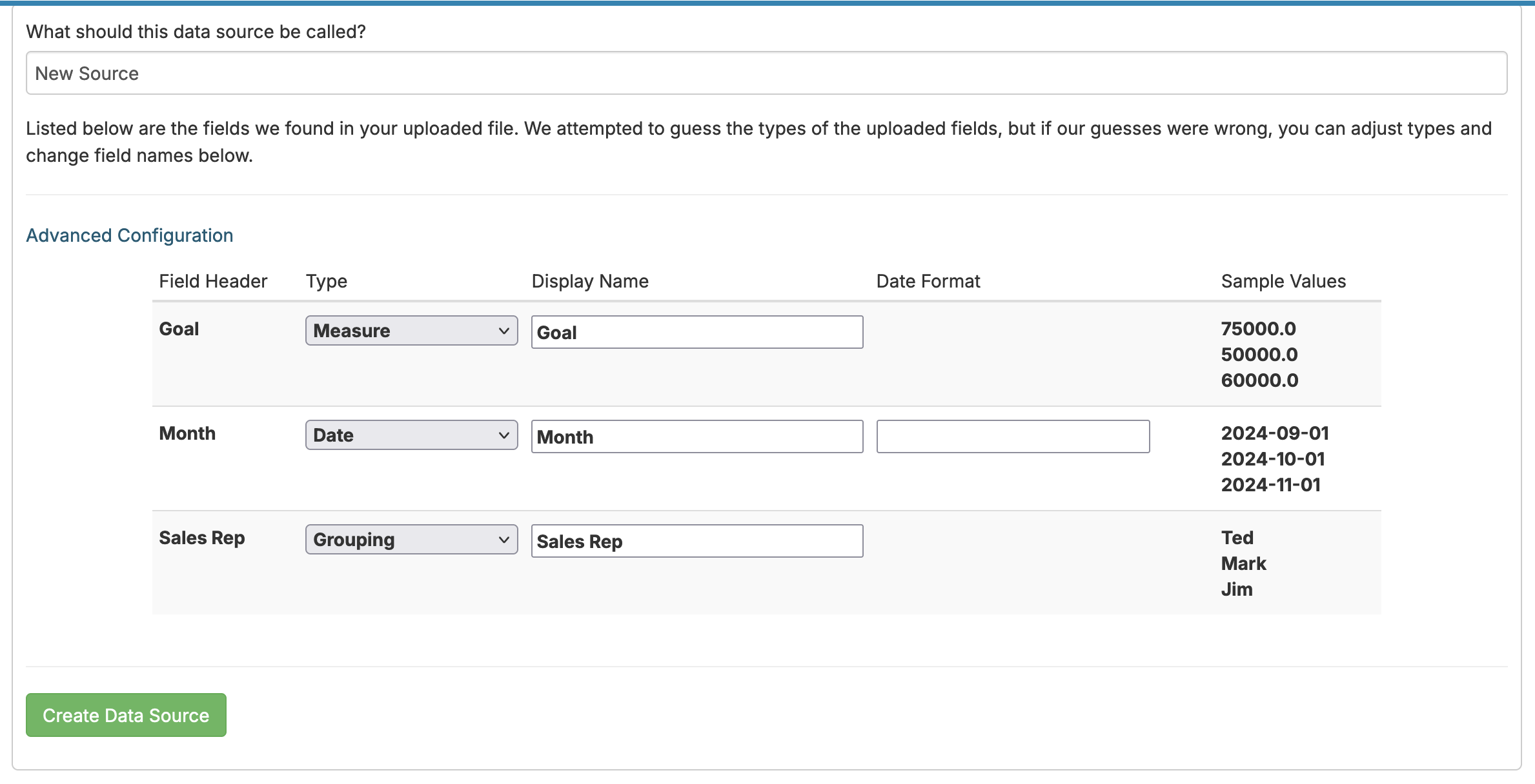 Please note that as of September, we've added an account level setting for the behavior on uploading a new Excel/CSV source. We previously had a more basic Excel/CSV support which only supported replacing or appending data. You can toggle your account to creating the more powerful user data source through the Account Settings page. See Account Settings for more details.