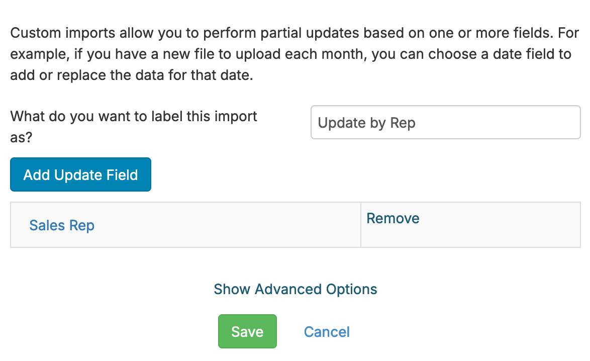 With an import, you can choose to replace all data or to update based on one or more fields. For example, you can set up: