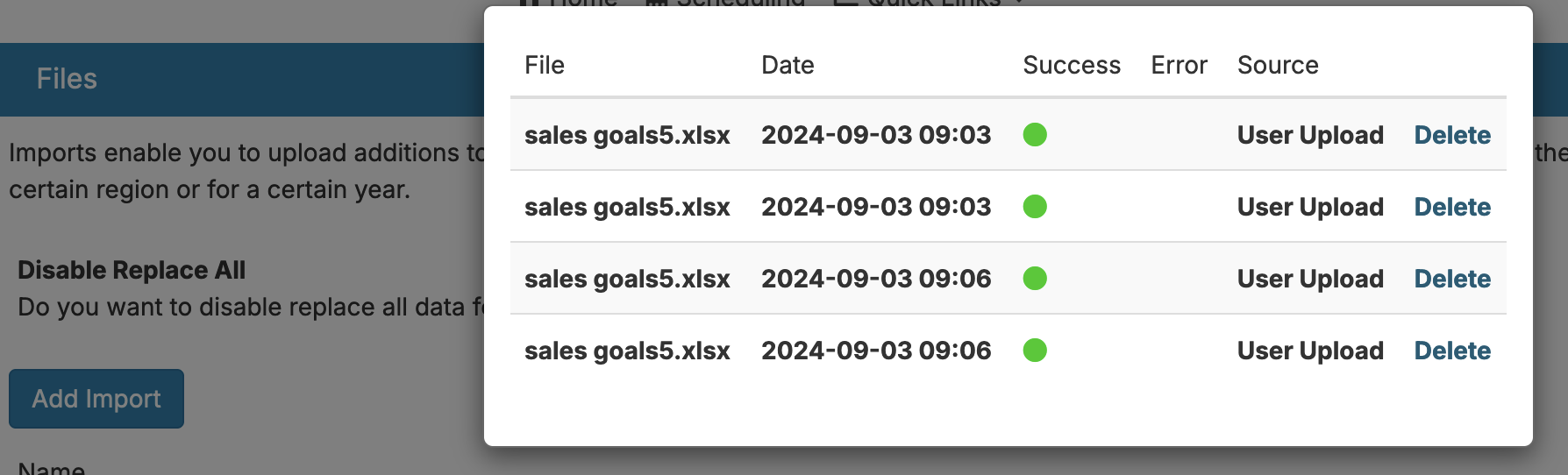 You can pull up the list of processed uploads and any errors around those uploads from the Imports page as well by going to the Files section on the control bar: